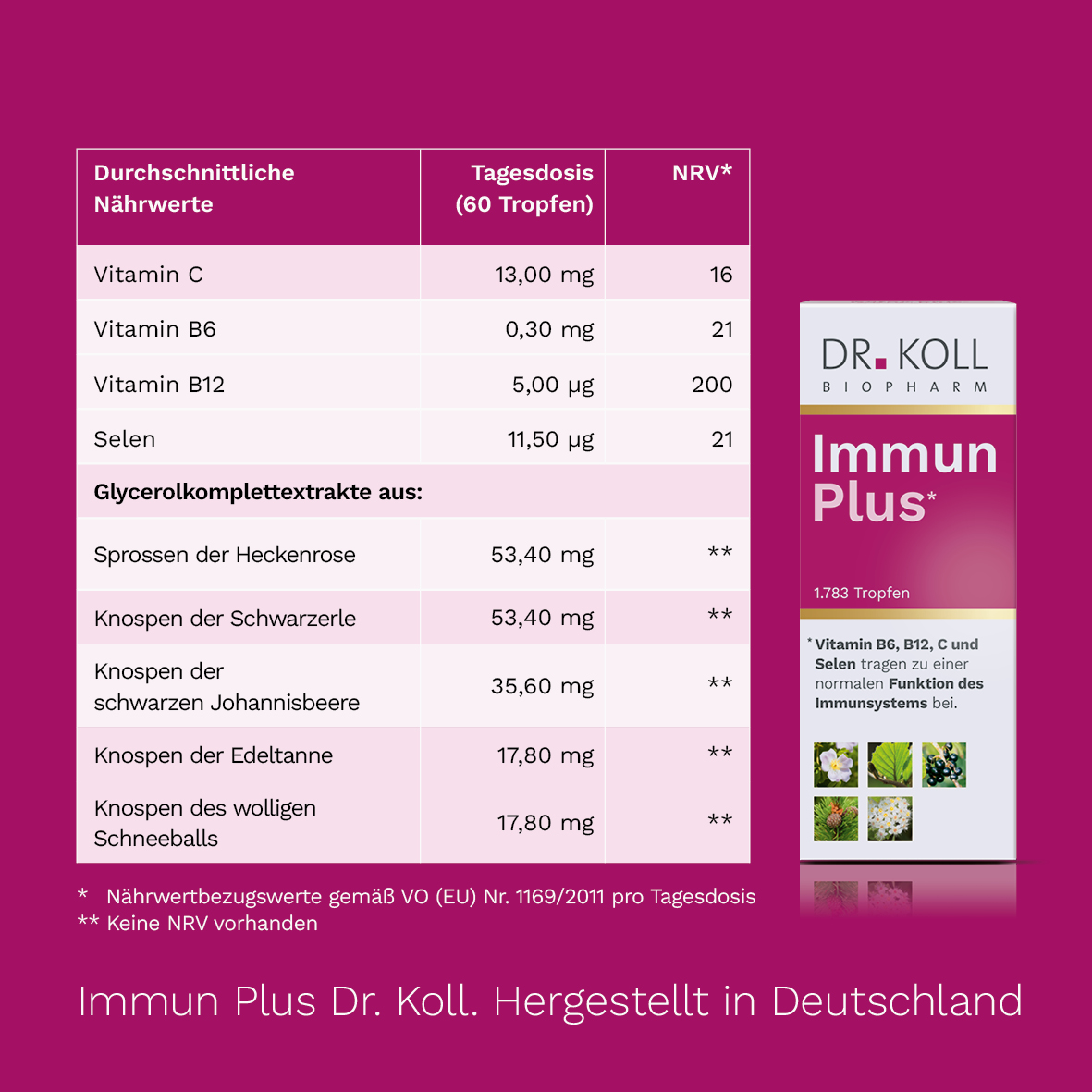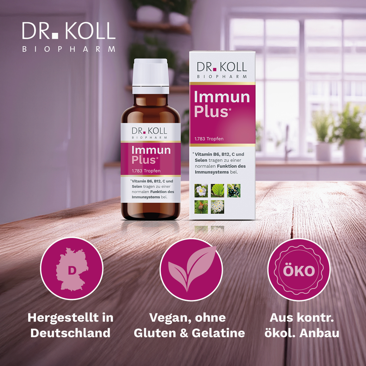 Ich mag das Immun Plus von Dr. Koll Biopharm. Vitamin C, B6 und B12 unterstützen mein Immunsystem in der kalten Jahreszeit. Vegan, bio und naturverbunden – klare Empfehlung.