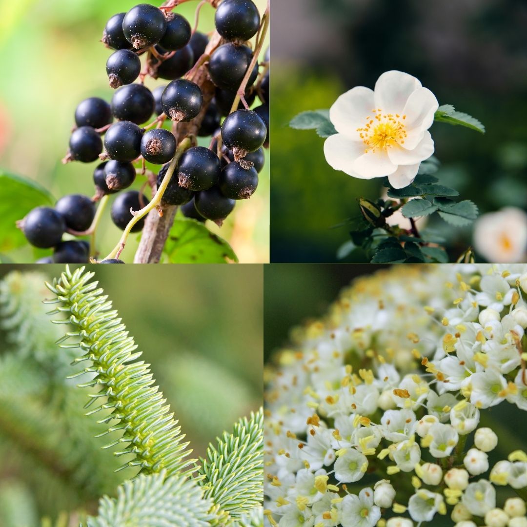 - Knospenkomplex mit Heckenrose, Schwarzerle, schwarze Johannisbeere, Edeltanne und wolligem Schneeball