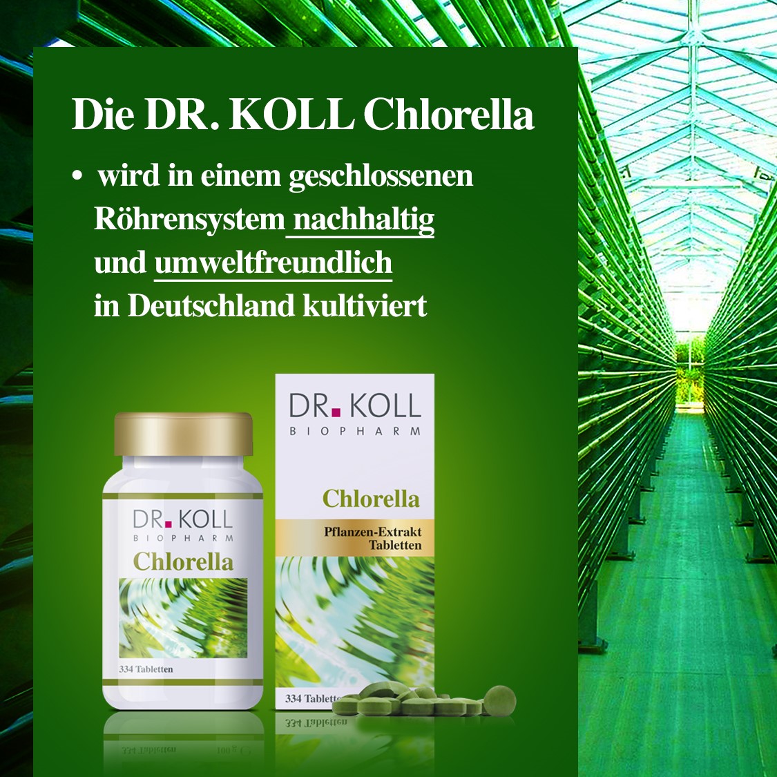 Das Chlorella von Dr. Koll wird in einem geschlossenen System in Deutschland kultiviert. Dieser Herstellungsprozess schließt eine Belastung der „Chlorella“ durch Schadstoffe aus der Umgebung aus.