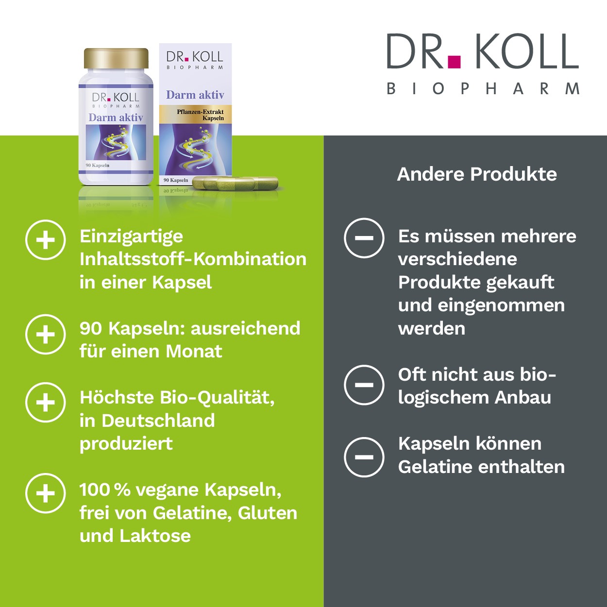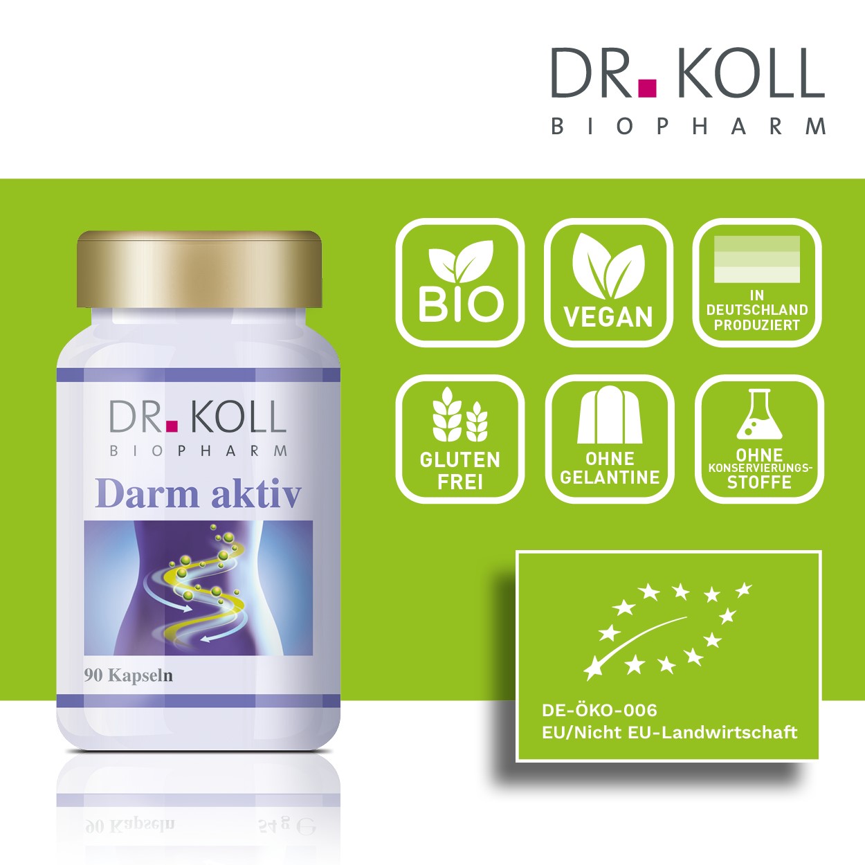 Das Nahrungsergänzungsmittel Darm aktiv von Dr. Koll kombiniert pflanzliche Ballaststoffe aus Lein- und Flohsamen, Gerstengras, Chlorella, Inulin mit anregenden Gewürzen wie Ingwer, Curcuma und Coriander. Alle Bestandteile der einzigartigen Kombination stammen aus kontrolliertem biozertifizierten Anbau und sind frei von Konservierungs- oder anderen Zusatzstoffen. Die Kapsel besteht aus einer pflanzlichen Hülle und ist zu 100 Prozent vegan.