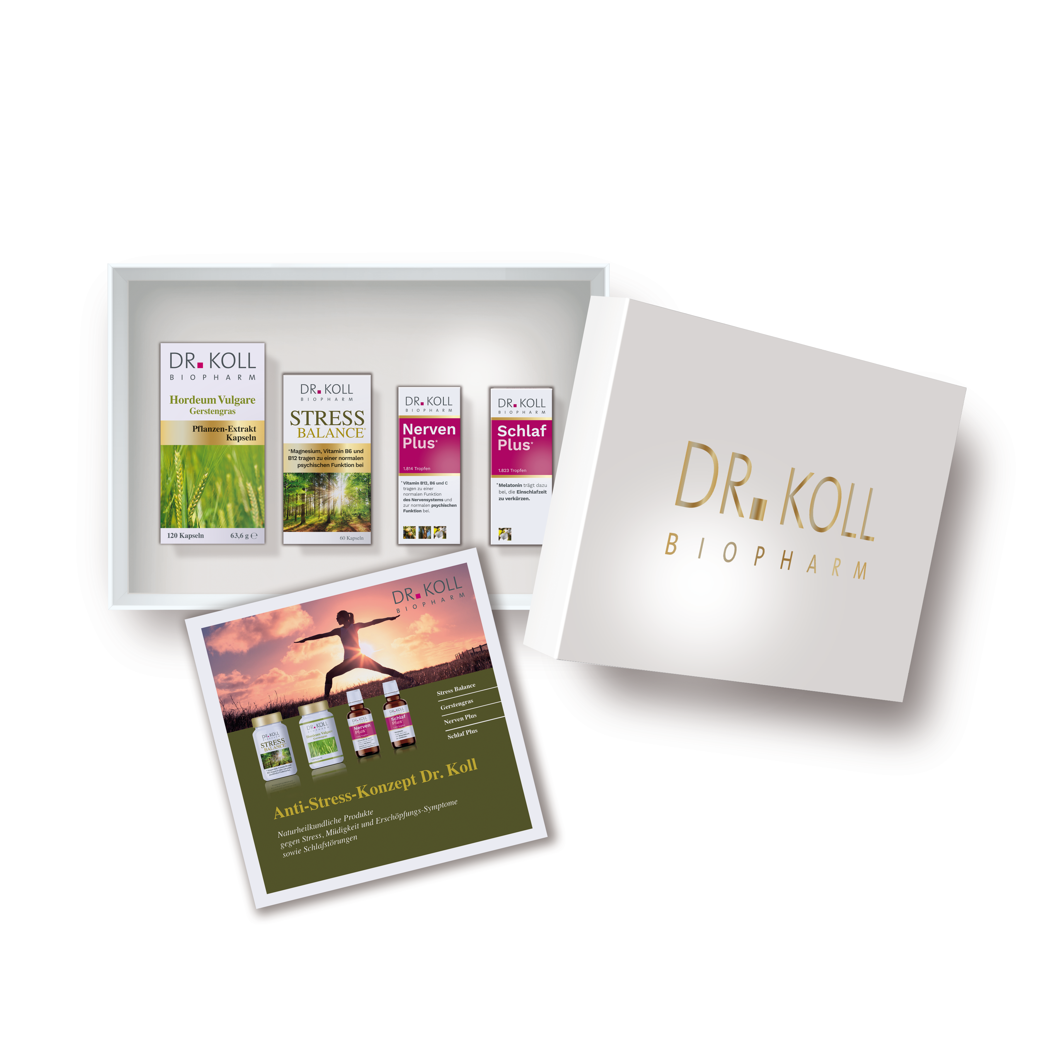 Zusätzlich enthalten ist eine Broschüre, in der die Dr. Koll Anti-Stress-Produkte und das Einnahmeschema detailliert vorgestellt werden!